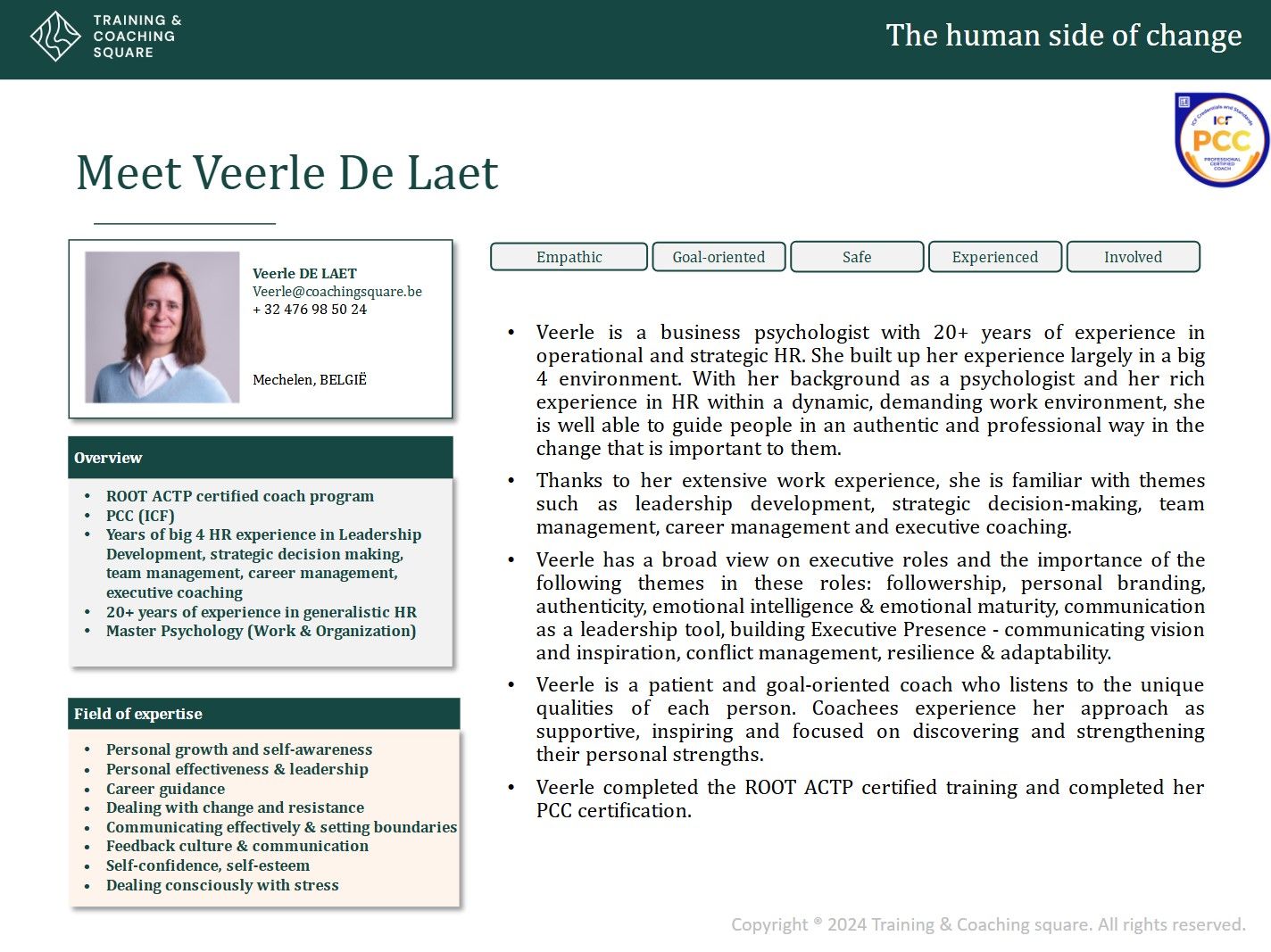 Veerle is a business psychologist with 20+ years of experience in operational and strategic HR. She built up her experience largely in a big 4 environment. With her background as a psychologist and her rich experience in HR within a dynamic, demanding work environment, she is well able to guide people in an authentic and professional way in the change that is important to them.