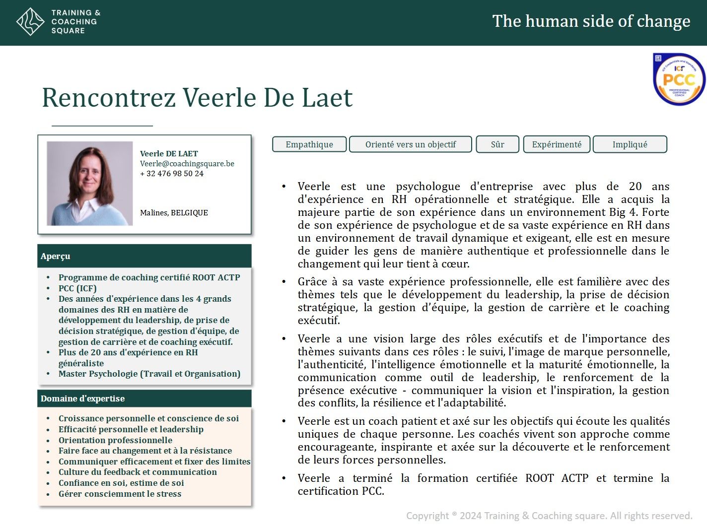 Veerle est une psychologue d'entreprise avec plus de 20 ans d'expérience en RH opérationnelle et stratégique. Elle a acquis la majeure partie de son expérience dans un environnement Big 4. Forte de son expérience de psychologue et de sa vaste expérience en RH dans un environnement de travail dynamique et exigeant, elle est en mesure de guider les gens de manière authentique et professionnelle dans le changement qui leur tient à cœur.