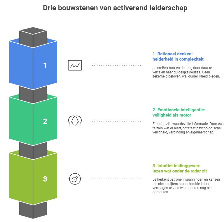 Activerend leidinggeven verbindt deze drie en gebruikt de spanning tussen ze als brandstof voor groei. Net zoals in coaching draait het om bewustzijn, aanwezig zijn, vragen stellen en mensen uitnodigen tot beweging.